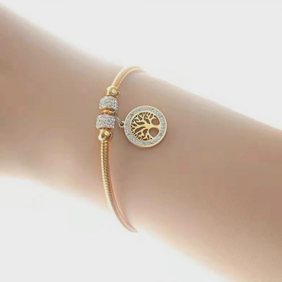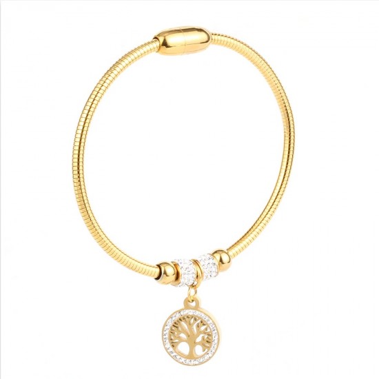 Bratara fixa din otel inoxidabil placata cu aur, cu inchizatoare cu magnet, avand ca piesa centrala un charm cu copacul vietii incrustat cu cristale si zirconii.