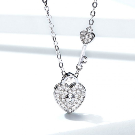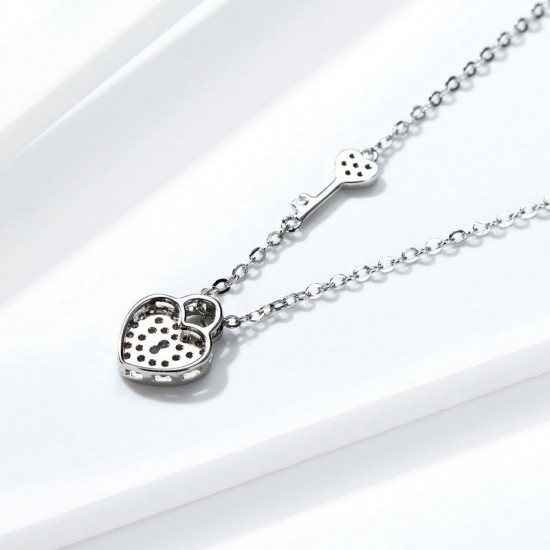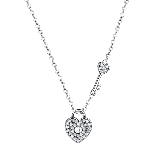 Colier din argint 925, placat cu rodiu, cu un pandantiv in forma de inima cu cheie incrustat cu cristale cubic zirconia.