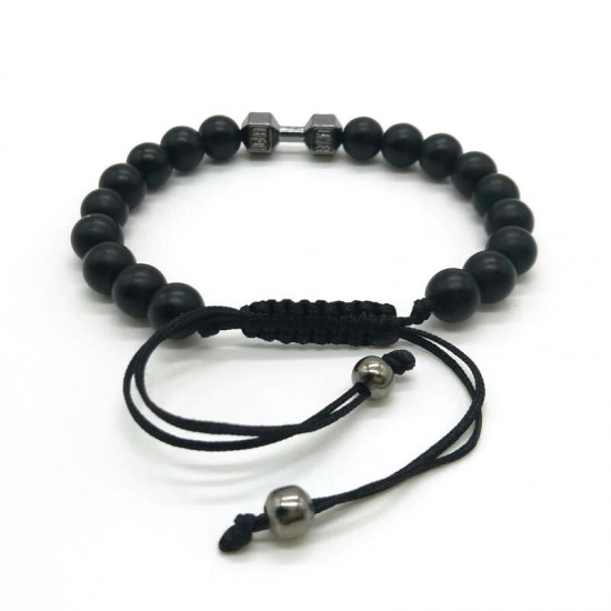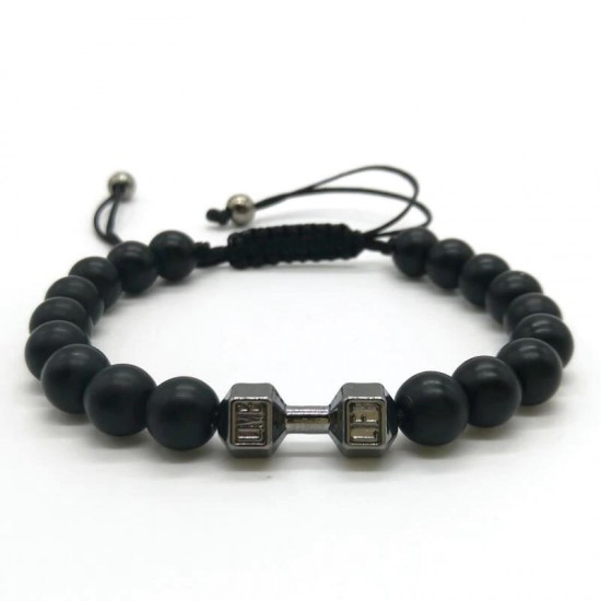 Bratara confectionata din pietre naturale negre de 8 mm, se face remarcata prin elementul central, haltera.