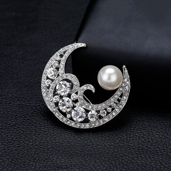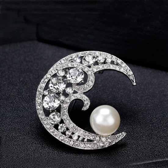 Brosa placata cu aur, in forma de semiluna incrustata cu cristale Swarovski si perla.