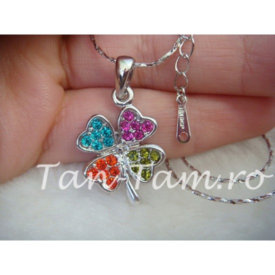 Colier cu pandantiv in forma de trifoi placat cu aur alb, marcat, decorat cu cristale cubic zirconia.