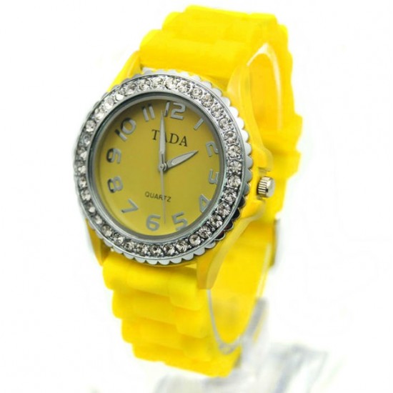 Ceas dama decorat de jur imprejur cu cristale, curea galbena de silicon, mecanism japonez foarte precis. Acest ceas se adreseaza tututor femeilor indraznete care isi doresc un ceas trendy, comod, care sa le coloreze vestimentatia si ziua.