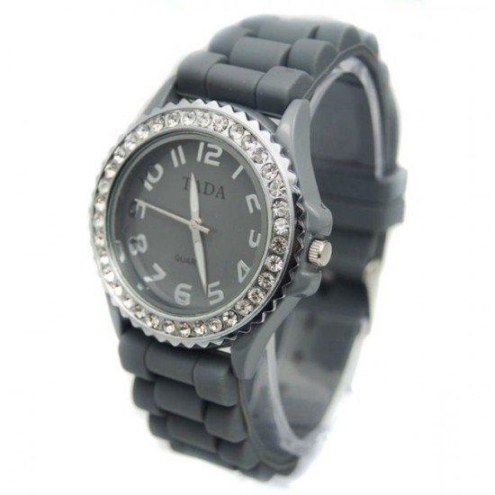 Ceas dama cu cristale, curea gri de silicon, mecanism japonez foarte precis. Ceasul de mana cu cristale poate fi purtat oriunde si in orice imprejurare. Este un accesoriu ideal pentru orice femeie indiferent de varsta.